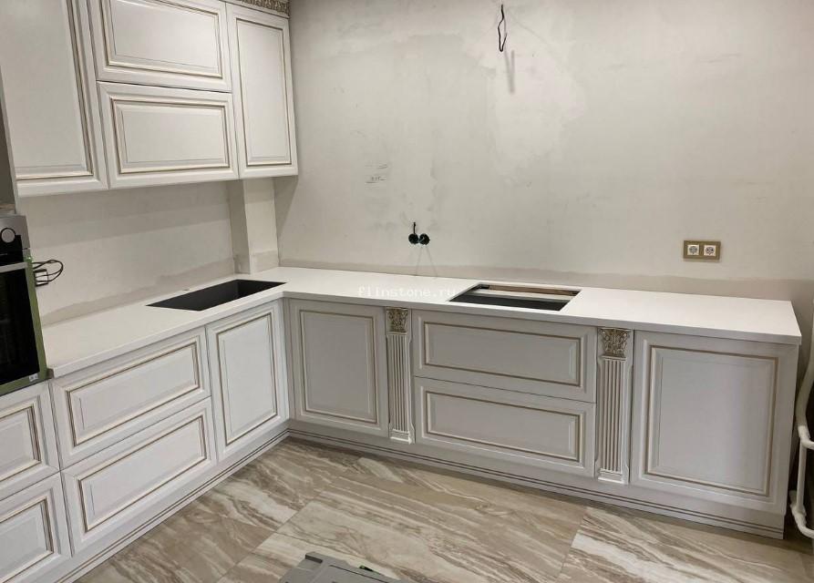 - Угловая или Г-образная: Эта форма столешницы может быть выполнена с мягкими закруглениями или с четкими геометрическими линиями. Угловая конструкция эффективно использует пространство, предоставляя дополнительные рабочие зоны и места для хранения.