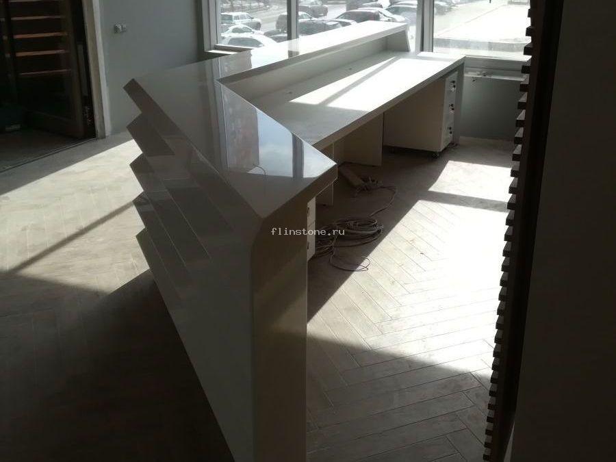 Стойки ресепшн из искусственного камня популярны в офисах, салонах красоты, их устанавливают на ресепшны гостиниц, отелей и других заведений. Актуально будут смотреться также и в жилых квартирах. Конструкции очень прочные, надежные, способны прослужить десятки лет.